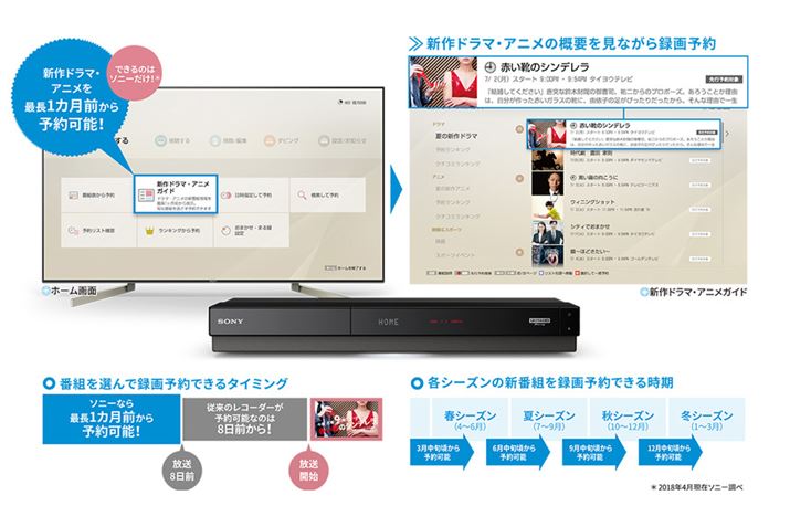 レコーダーとしては4Kになってもソニーの録画機能を正当進化させていて、「おまかせ・まる録」の自動録画や、新作ドラマ・アニメを最長1か月先から先行予約できる「新作ドラマ・アニメガイド」、ネット連携による「みんなの予約ランキング」といったアイデアが秀逸。スマホ視聴は有料ながら、「Video & TV SideView」アプリで4K録画番組の視聴も可能だ。他社製も含めたディスプレイごと、ソース毎に画質を自動調整する「おまかせ画質モード」もユニーク。