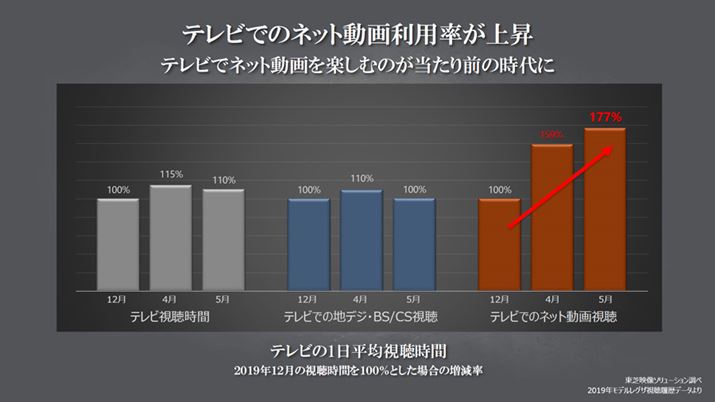 テレビで視聴するコンテンツも大きな変化が起きているそう。在宅時間が増えたことで、放送コンテンツの視聴時間も伸びているが、それを大幅に上回る視聴時間となっているのがネット動画だそうだ