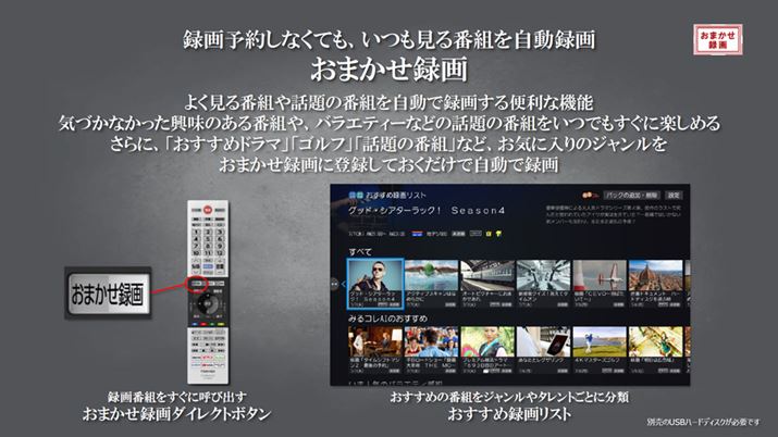 ネット動画の快適視聴以外では、「おまかせ録画」にも注目だ。プライベートシーンを想定したテレビということで、V34シリーズのチューナー数は2つ、録画機能も外付けのUSB HDDを使って1番組録画できる「ウラ録」止まりとなっているのだが、独自機能の「みるコレ」と連携することで、よく見る番組や話題の番組を効率よく自動で録画してくれるようになっているのだ。しかも、外付けHDDを使ったテレビの録画機能なのに、ネット動画同様に高速レスポンスを実現。録画番組のシーン検索なども高速で再生してくれるのだ。こういったアプローチは、テレビ放送の録画機能にいち早く注力したレグザらしいポイントといえるだろう。