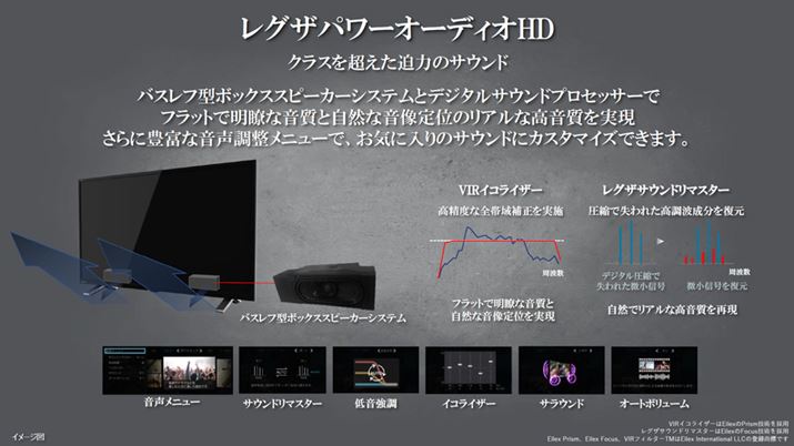 バスレフ型ボックススピーカーシステムとデジタルサウンドプロセッサーを組み合わせた独自の「レグザパワーオーディオ HD」。4K液晶テレビ「M540X」と同じ高音質アルゴリズムを用い、V34シリーズのスピーカーシステムに合わせてチューニングしているそうだ