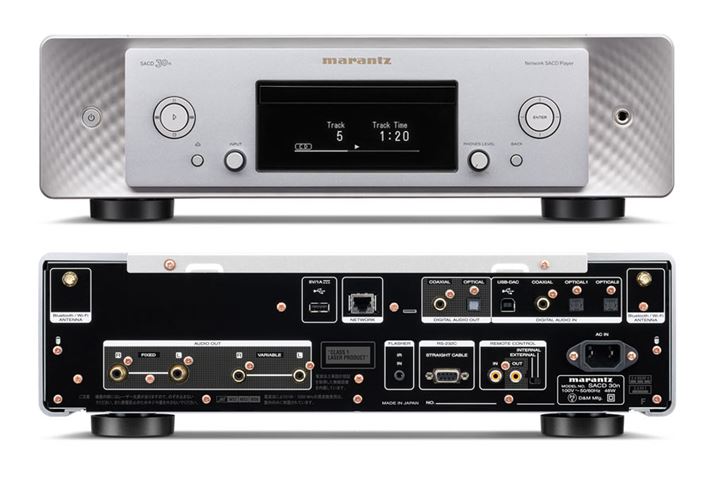 まずは、ネットワーク機能を搭載するSACDプレーヤー、SACD 30nから紹介しよう。基本のSACD/CD再生のほか、マランツ独自のネットワーク再生システム「HEOSテクノロジー」によるネットワーク再生、Amazon Music HDなどの音楽ストリーミングサービスの聴取が可能だ。ワイヤレス再生ではAirPlay 2、Bluetoothに対応。ハイレゾは最大192kHz/24bit PCMおよび5.6MHz DSDまでの入力ソースに対応し、ディスクに記録したハイレゾ音源の再生も行える。