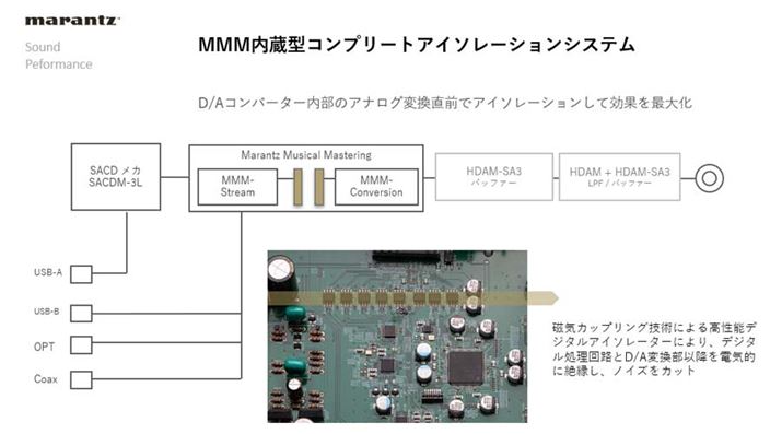 その内部には、フラッグシップモデル「SA-10」から継承するオリジナルのディスクリートDAC「Marantz Musical Mastering(MMM)」を採用。MMMは、デジタル基板に配置するデジタルフィルター「MMM-Stream」と、そこから出力されるDSD信号をアナログ変換する「MMM-Conversion」(アナログ基板に配置)で構成される。MMM-Streamが独自のアルゴリズムによってPCM信号を1bit DSDデータに変換し、後段のMMM-Conversionに送り出す仕組みになっており、その処理をすべて自社開発のアルゴリズム&パラメーターで行うことで、マランツの理想とするサウンドを具現化するというものだ。