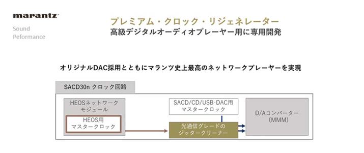 また本機は、先述の通り「マランツ史上最高のネットワーク再生」をうたっている。そのポイントは、オリジナルDACの採用とともにネットワーク再生時の高品位クロック供給を実現するプレミアム・クロック・リジェネレーターを搭載していること。これによりHEOSネットワークのプレミアム化を実現し、SACD/CD/USB-DACクロックとしてもグレードアップした。