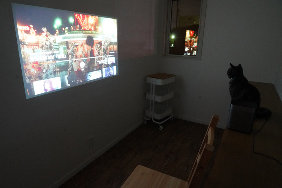 Android TVのホーム画面にたどり着けば、あとは活用するのみ。最初にXGIMI「Halo」の明るさをチェックしてみた。照明を落とした環境だとクッキリ明るい輝度感で、部屋の照明をつけた状態でも画面の白っぽさを我慢すれば試聴できる。ただ、やはりオススメなのは暗室での利用だろう。明るい部屋での見え方は写真も参考にしてほしい。