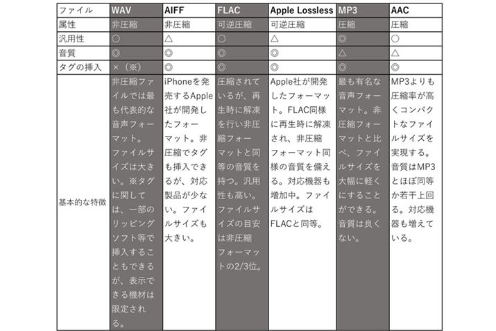 CDをデータ化して作られる音楽ファイルは、複数のフォーマットが選択できる。現在代表的なフォーマットはWAV、FLAC、AAC、MP3など。その種類は、(A)非圧縮ファイル、(B)可逆圧縮ファイル、(C)圧縮ファイルの3つに分類される。以下の表をご参照いただきたい。