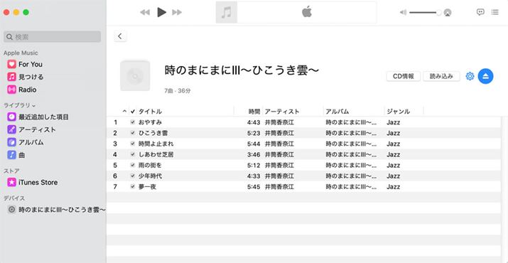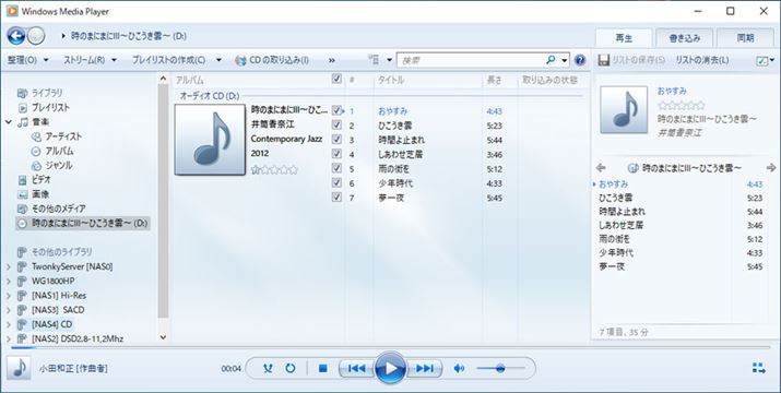 取り込んだ楽曲データを再生すると、リッピング時に自動で取り込まれた楽曲目やアーティスト名、ジャケット画像などが表示されるようになる(なお、WAV形式だと基本はタグの入力ができないため、ジャケット写真の表示などがされないことに注意)