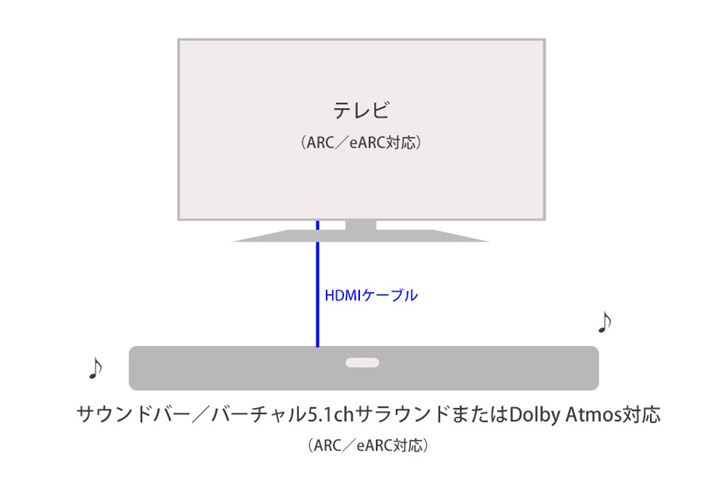 テレビとオーディオ機器をHDMIケーブルで直結し、テレビ内蔵の映像配信サービスから3Dサラウンド対応コンテンツをネイティブ再生する場合、テレビ自体がその信号をHDMI出力できることが必須となる(HDMI端子のARC/eARC対応など)。このあたりは製品によって異なるので、個別に確認されたい。