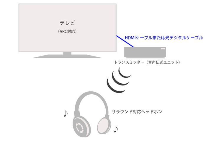 基本的に、サラウンドヘッドホンは本体(トランスミッター)とヘッドホン部で構成される。テレビとトランスミッターをHDMIケーブルもしくは光デジタルケーブルで接続し、そこからヘッドホンに音声をワイヤレス出力する仕組みだ。