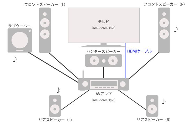 続いては、視聴者の周りを複数のスピーカーで取り囲む、最もスタンダードで本格的なサラウンド再生環境について。サラウンドの英訳「取り囲む」を、スピーカーで実現したシステムである。テレビの音声をAVアンプで受け取り、そこから複数スピーカーへ出力する。
