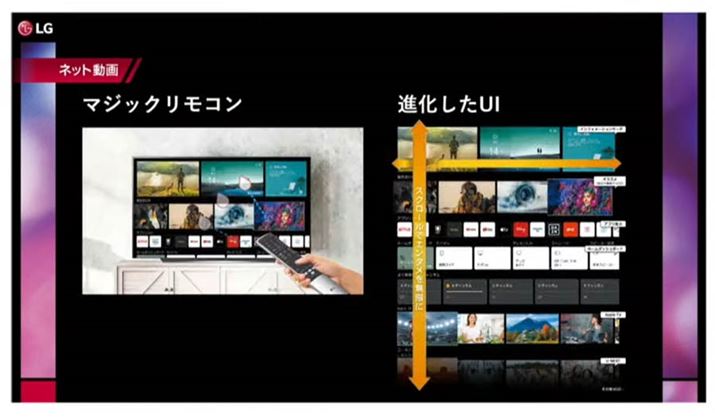LGならではのスマートテレビ機能については、同時発表された有機ELテレビ「OLED G1」シリーズ等と共通で強化されている。OSは「webOS 6.0」を採用しており、UIは洗練された印象に。人気のネット動画を快適に視聴できるよう、新しいマジックリモコンとUIで操作性を向上している。「Netflix」や「Amazonプライム・ビデオ」などさまざまな動画配信サービスに対応しており、「weverse」「V LIVE」などの人気サービスも新たに追加された。