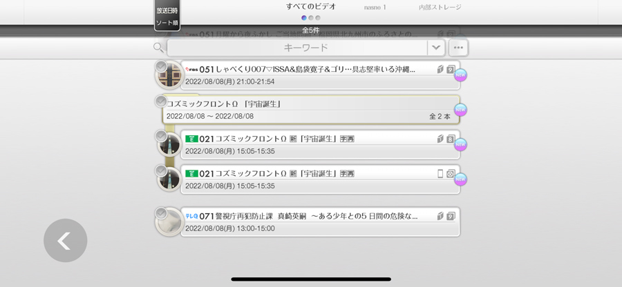 通常の録画番組にはnasneのアイコンが、書き出した番組にはスマホのアイコンが表示される