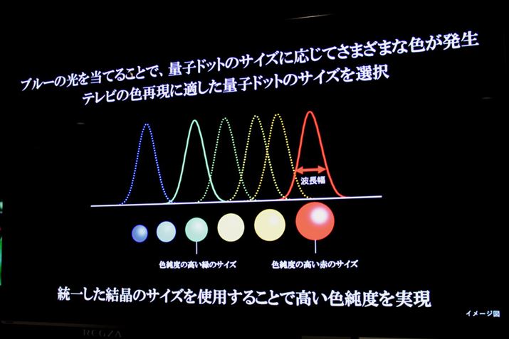 テレビなどのディスプレイにおける量子ドットとは、半導体微粒子を数百から数千個集めたもの、ならびにそこに入射した光を別の色に変換する技術のこと。ブルーの光を当てると、量子ドットの大きさに応じた異なる色を発する特性があるのだ。量子ドットの大きさを厳密に管理することで、波長幅の短い、色純度の高い再現性を期待できる。