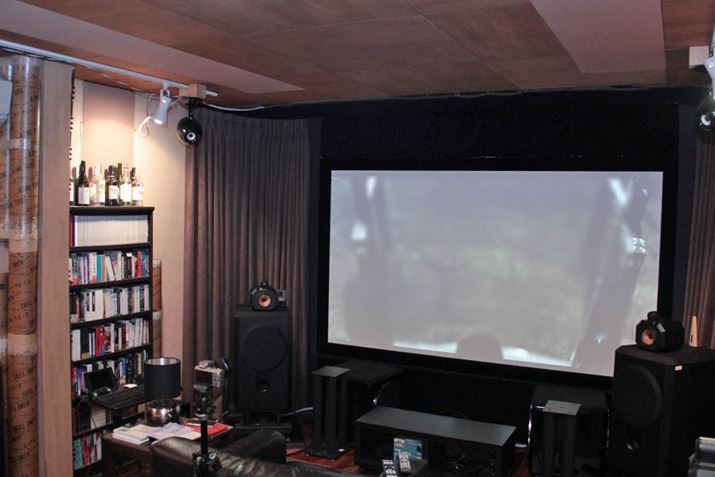 テストは自宅の視聴室にて実施。スクリーンはオーエスのピュアマットIII(120インチ、16:9)。天井に吊り設置されているのはソニー「VPL-VW500ES」。かつてのメインプロジェクターだ