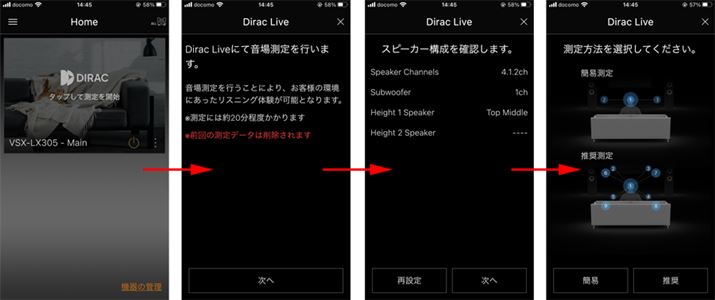 「Advanced MCACC」と「Dirac Live」はどちらも付属のマイクで測定を行う仕組み。この日は3か所による簡易測定を実施。後述の「TX-RZ50」でも、「Dirac Live」を利用する手順はまったく同じだった
