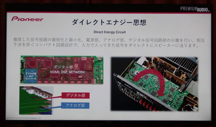 「ダイレクトエナジー思想」とは、アンプに入ってきた音をダイレクトにスピーカーに伝えるという考え方のこと。そのために徹底した信号経路の短絡化、電源/アナログ/デジタル系回路の分離が施される。
