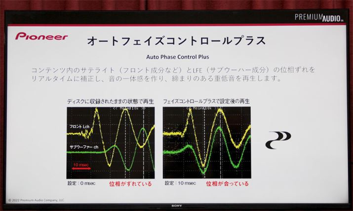 マルチチャンネルの音声制作時、ローパスフィルターをかけてLFE成分をつくるとLFEだけが相対的に遅れてしまい、それがそのまま音源として収録されている場合があるとパイオニアは指摘する。それを再生時にリアルタイムで検出し、全自動で補正する独自の機能だ。他社製AVアンプでもLFEの遅れを補正する機能はあるが、あくまで手動で任意の数値を入れる形なのだ。