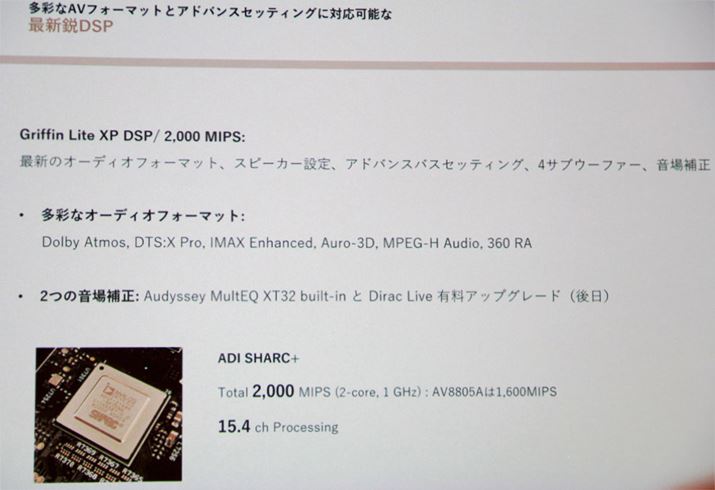既発売の「CINEMA 50」などと同様に、最新DSP「Griffin Lite XP」を搭載。信号処理能力を向上させた結果、「AV10」では最大15.4ch分のプロセッシングに対応する。オーバーヘッド(トップ/ハイト)スピーカーの最大アサイン数は6。4つのサブウーハーを使ったベースマネージメント「指向性」モードも搭載する。
