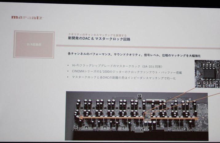デジタル音声信号の同期を図るマスタークロックは、マランツのハイエンドCD/SACDプレーヤー「SA-10」と同じグレード。また、回路内の遅延差を吸収するクロックバッファは弟機「CINEMA 50」と比較して1000分の1の低ジッター(ノイズ)に抑えられているという。