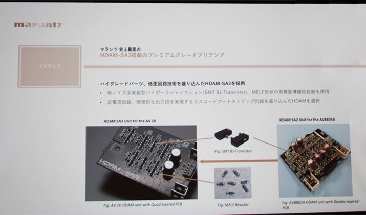 「AV10」のプリアンプ部には、マランツのオリジナルディスクリートアンプモジュール「HDAM SA-3」を採用する。以前からAVアンプでの「HDAM SA-3」採用案はあったが、予算面での都合もあり、なかなか叶わなかったという。「HDAM」には「HDAM SA-2」というバリエーションがあり、両者にはグレードの差があるというよりは適材適所による使い分けが基本とのこと。「AV10」では予算や回路規模の問題をクリアし、無事適材適所で「HDAM SA-3」を採用できたということのようだ。