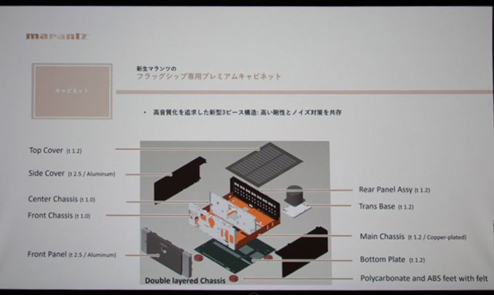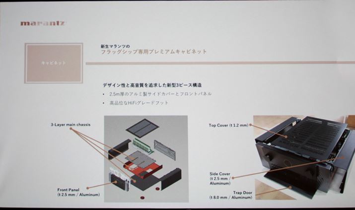200W(8Ω)出力のアンプ16個をひとつの箱に収めるにあたり、マランツのプリメインアンプ「PM10」などで得たD級増幅アンプの知見を生かして作られたという。開発に要した時間は足掛け5年。「AV10」同様に、キャビネットから心臓部であるアンプ回路まで一新されたまったくの新モデルだと言える。