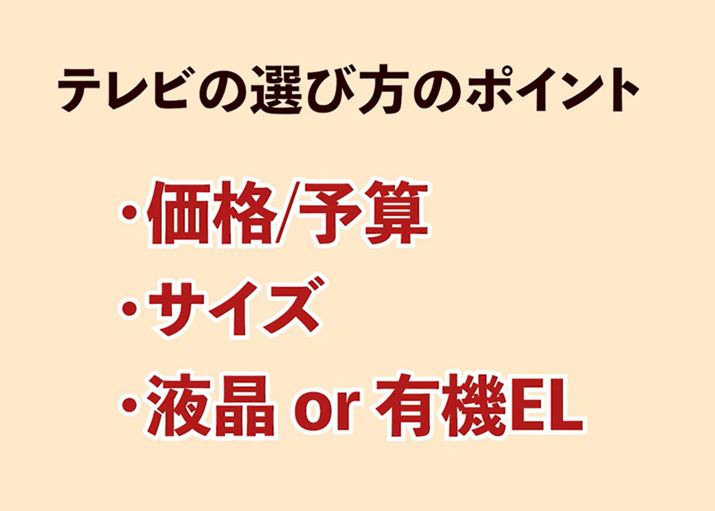 まず、テレビを選ぶ際に決めておきたいのは、予算(製品の価格)、希望のサイズ、そして有機ELテレビを選ぶかどうか、この3つです。