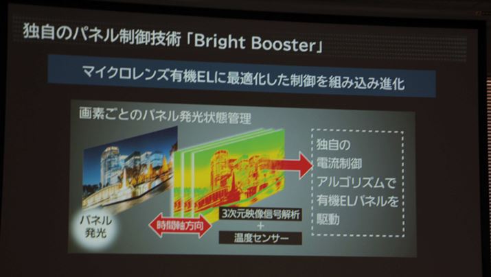 上記のディスプレイ部の動きを制御する独自技術「Bright Booster」は2022年モデルから踏襲。映像信号の解析、温度センサーの監視をリアルタイムで行い、有機ELパネルを駆動する。