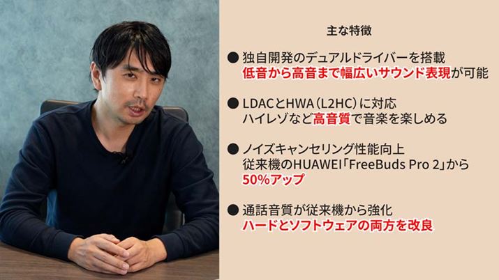 通話やWeb会議で使う際に重要なマイクは、新しく搭載された骨伝導VPUセンサーと、トリプルマイクによりユーザーの声を正確に集音。さらに、機械学習を活用した「DNNアルゴリズム」により、従来機「HUAWEI FreeBuds Pro 2」比で風切り音のノイズキャンセリング性能が80%、環境ノイズキャンセリング性能が5dB向上したとのことです。