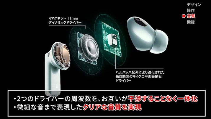 最初に「HUAWEI FreeBuds Pro 3」の基本スペックや特徴的な機能を紹介しましょう。イヤホンの音質のかなめとなるドライバーは、11mmのダイナミックドライバーと、マイクロ平面振動板ドライバーを搭載します。この2基のドライバーにより14Hzから48KHzまでの幅広いサウンド表現が可能になっています。