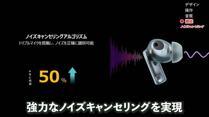 続いては、本機の特徴的な機能をレビューしましょう。ノイズキャンセリングについては、3つのマイクによってノイズを識別し、それをファーウェイの最新アルゴリズム「インテリジェント・ダイナミックANC3.0」で処理することで強力なノイズキャンセリングを実現しています。