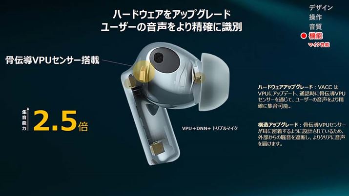 電話やWeb会議での利用において重要なマイク性能(通話音質)については、従来機からハードウェアとソフトウェアの両方を改良することで、風切り音や環境音のノイズ低減性能が向上したとのことです。