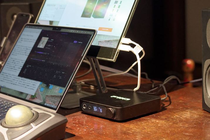 ざっと触ってみて、デスクトップまわりをすっきりさせたいPCユーザー、バランスヘッドホン出力を使いたいヘッドホンマニアが、時折アクティブスピーカーとも組み合わせて使う製品かな、と推察して試聴スタートします。