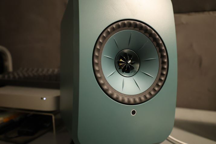 115mm径のウーハーを搭載したコンパクトなKEFのアクティブスピーカー「LSX II LT」。本体色は写真のセージグリーンのほか、グラファイトグレー、ストーンホワイトの計3種