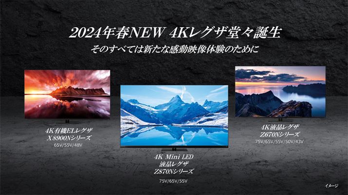 TVS REGZAは、2024年モデルの「4Kレグザ」として有機ELテレビ「X8900N」、Mini LEDバックライトを搭載した液晶テレビ「Z870N」、スタンダードな液晶テレビ「Z670N」3シリーズを発表した。すべてのモデルが4K解像度で、各シリーズのラインアップは以下のとおり。