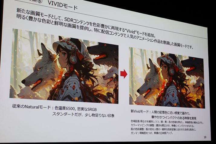 しかし、昨今のテレビアニメ作品などを見るにはどうしても地味だと思われる節があったという。そこで企画されたのが「Vivid」モード。色を鮮やかに見せて、色温度も7500Kへ変更、ガンマもよりコントラスト感が出るように明暗差をつけるなど、“映え”重視と言える構成だ。ビクター流のアニメモードと言ったところだろう。