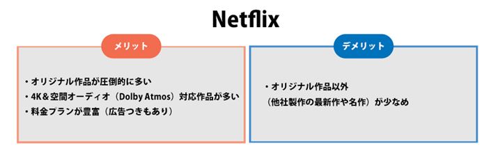料金プランのバリエーションや画質・音質への配慮、視聴機能なども手厚いが、ひとつ注意すべきはオリジナル作品以外の画質・音質について。4K解像度&Dolby Atmosの再生に対応する「プレミアムプラン」を契約していても、他社制作作品(たとえばソニーピクチャーズ系の作品など)の多くはフルHD解像度&5.1chまでの対応となっているので、クオリティ重視のユーザーは注意したい。また、最近では料金プランの見直し(「ベーシックプラン」の新規受付終了)、別世帯とのアカウント共有の禁止など、サービス内容がこまめに更新される点にも気をつけたいところだ。