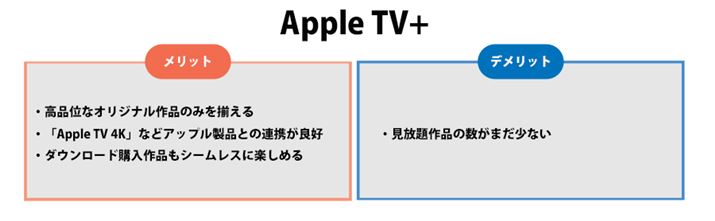 「Apple TV+」で配信されるほとんどの作品の映像は4K+HDR(Dolby Vision)、音声はDolby Atmosまで対応。“量より質”を徹底して他サービスとの差別化を図っている(先述のように、コロナ禍で劇場公開がキャンセルされたために権利を買い取り、独占配信した作品なども含まれる)。「Apple TV」内でダウンロード購入できる作品も4Kが基本なので、AV的なクオリティ重視のユーザーとの親和性がきわめて高い。