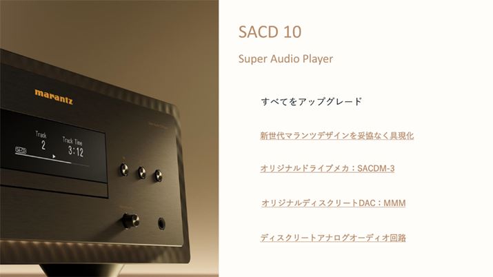 D/Aコンバーターは汎用のICではなく、マランツオリジナルのディスクリート回路「Marantz Musical Mastering(MMM)」。オーバーサンプリングなどを行う「MMM-Stream」とそこで得られたDSD信号をアナログ変換する「MMM-Conversion」からなる。後段の「MMM-Conversion」中のアナログフィルターを改善したことが「SACD 10」におけるポイントだという