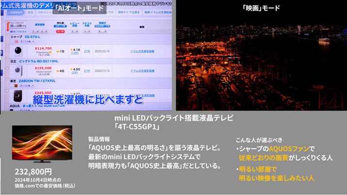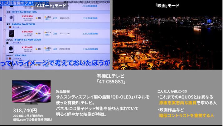 次に切り出した写真は、白バックで製品を解説するシーンです。こちらの写真を見ると、左のmini LEDバックライト搭載液晶テレビ「4T-C55GP1」のほうが「明るい映像」のように見えませんか。これは液晶テレビが全面で(広い面積で)明るい映像を映すことに長けていることに由来していると考えられます。