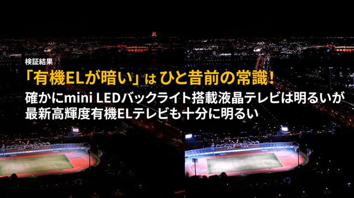 ここまで比較動画、写真を見ていただき、特に最新の高輝度有機ELテレビの映像は決して「暗くない」とわかっていただけたのではないでしょうか。もちろん、もっと明るい映像のmini LEDバックライト搭載液晶テレビもありますし、もう少し安い(高輝度パネルを搭載しない)有機ELテレビは「GS1」シリーズほど明るくはありません。