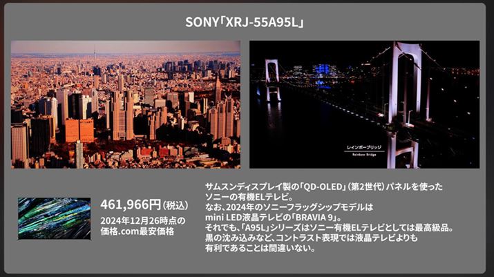 集めたのは主要メーカーの有機EL最上位モデル5機種。画像内の価格は2024年12月26日時点の価格.com最安価格だ