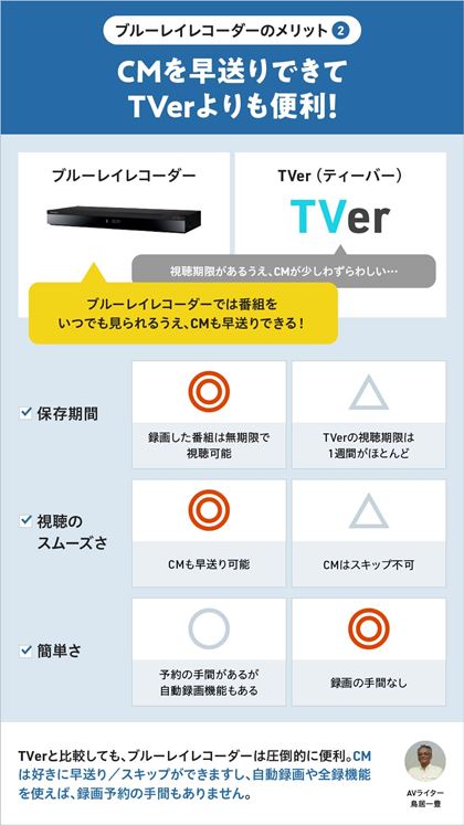TVerを例にとると、そもそもすべての番組が配信されているわけではありませんし、視聴できるのは1週間など期限もあります。いっぽうのブルーレイレコーダーは一度保存すれば期限なく好きなときに視聴できるうえ、CMを早送り/スキップできるなどの便利機能も多数備えています