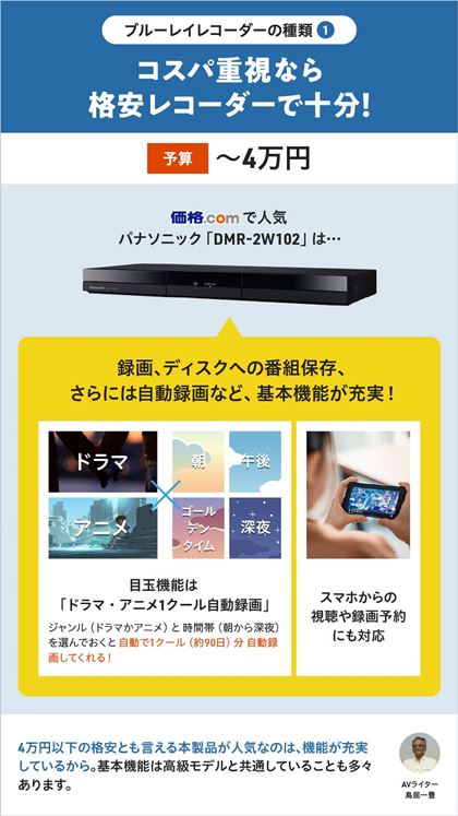 DVD、ブルーレイソフトの再生、録画した番組をディスクに残せればOKならば、パナソニック「DMR-2W102」がおすすめ。ドラマ・アニメを約90日分自動録画してくれる「ドラマ・アニメ1クール自動録画」機能などは上位機とほぼ同様のお買い得モデルです。