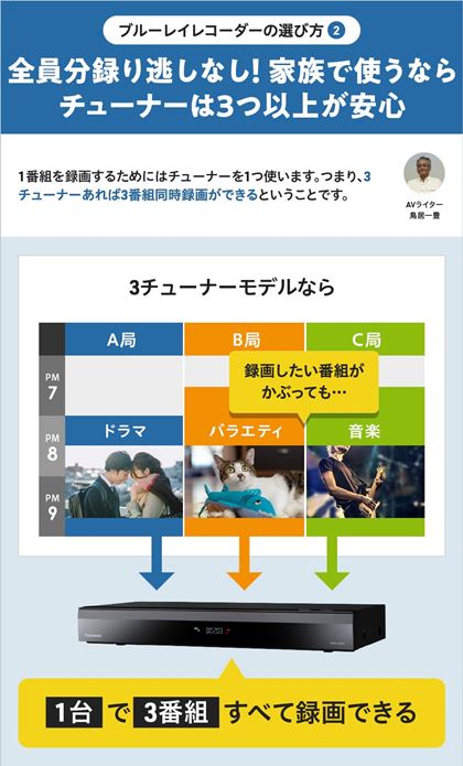 ブルーレイレコーダーの選び方(2) 家族で使うならチューナー数は3つ以上あると安心
