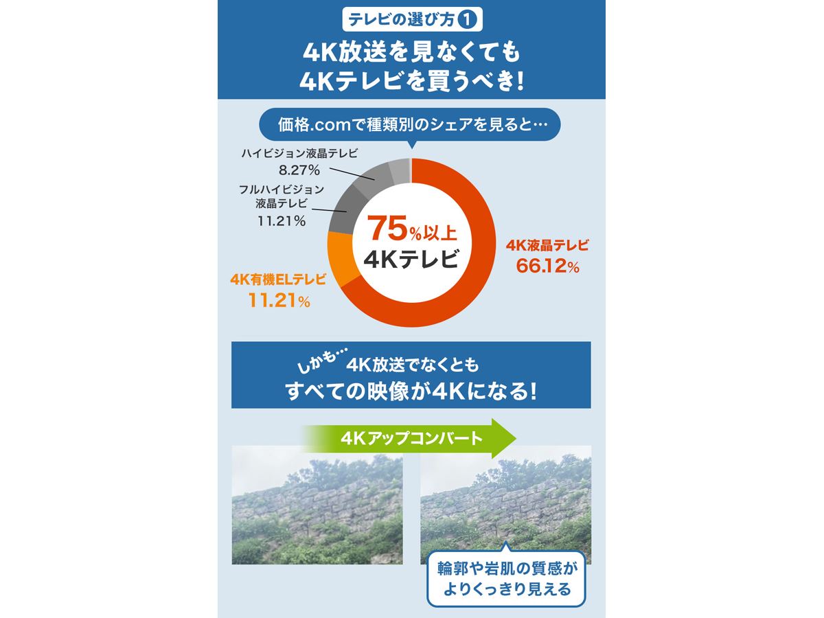 今や42V型(インチ)以上のテレビは基本的に4K。どうしても小型がよいとき以外は、4Kテレビを前提として考えましょう。