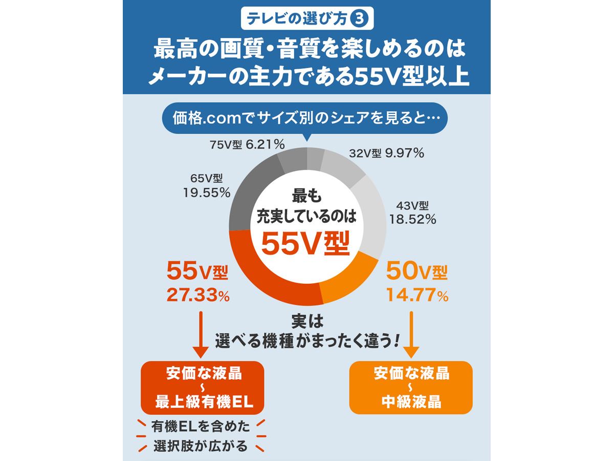メーカーが力を入れているのは55V型と65V型。最高画質・音質のテレビを求めるならば55V型以上のサイズを選ぶ必要があります。