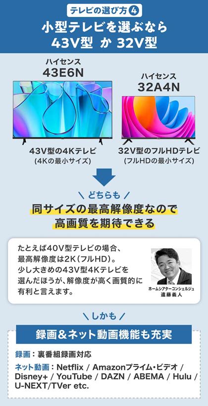まずはTVS REGZAに限らない基本的なテレビの選び方を確認してみましょう。これから選ぶならば、4Kテレビを検討すべきです。これから選ぶならば、まずは4Kテレビを検討すべきです。そのうえで高画質を求めるならば55V型以上がおすすめ。小さいテレビが欲しい場合の有力候補は43V型、さらに小さいテレビならば4Kよりも解像度が下がりますが32V型がおすすめです。