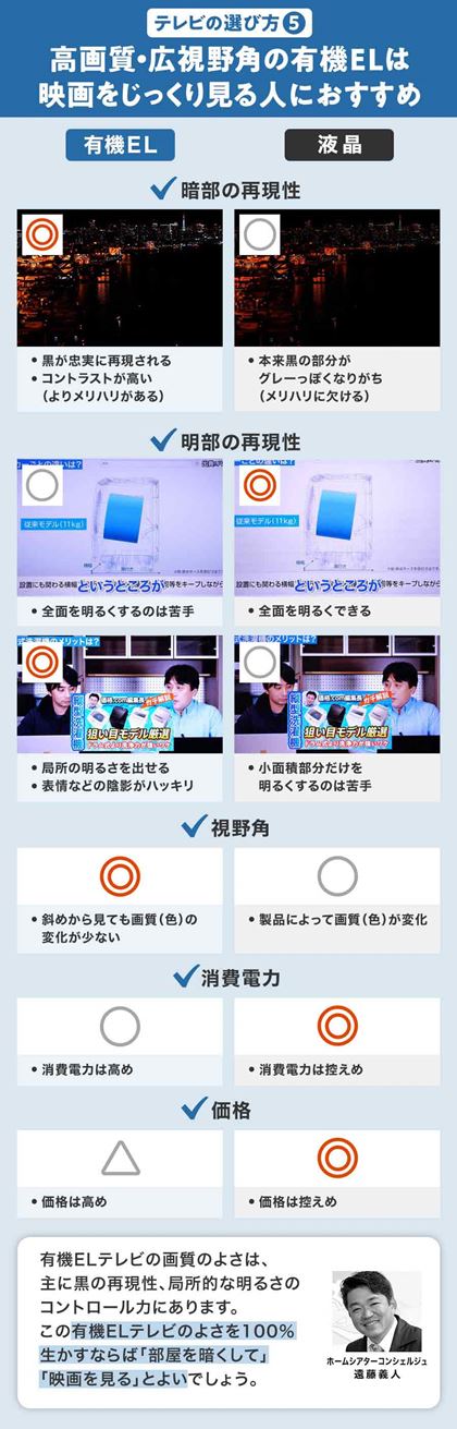 有機ELテレビは総じて画質がよく、グレーではない黒らしい黒を再現できることが特徴です。正確な光の表現ができるため、映像に臨場感が出るのです。また、視野角が広い(斜めから見ても色が変わりにくい)ことも大きな特徴です。ひと昔前の有機ELテレビは液晶テレビよりも暗いと言われていましたが、最新モデルでは明るさに不足はなく、どのような環境でも使いやすいテレビだと言えます。