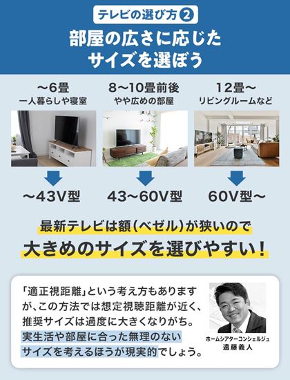 最新のテレビは画面周辺の額(ベゼル)が細くなっており、とても省スペース。もし10年ほど前のテレビからの買い替えならば、思っていたよりも大きなサイズが候補になるはずです。