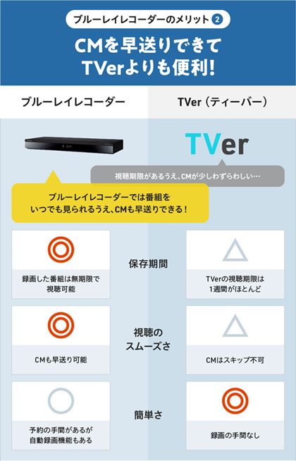 TVerを例にとると、そもそもすべての番組が配信されているわけではありませんし、視聴できるのは1週間など期限もあります。いっぽうのブルーレイレコーダーは一度保存すれば期限なく好きなときに視聴できるうえ、CMを早送り/スキップできるなどの便利機能も多数備えています