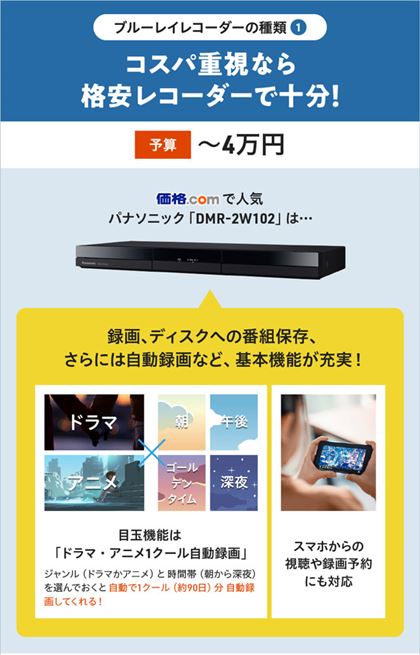 格安モデルであればブルーレイレコーダーは3万円台後半から購入可能です。こうした価格の製品でも実は基本機能は十分。価格.comで人気の製品は、パナソニックの「DMR-2W102」です。もう少し(3,000円程度)安い製品はありますが、発売日が新しく、機能が充実したこの製品が人気になることは当然と言えるでしょう。ここで数千円を渋ることはおすすめしません。数千円の違いが使い勝手に大きく影響する可能性があるからです。